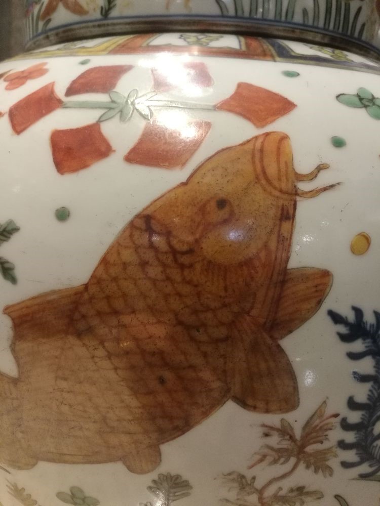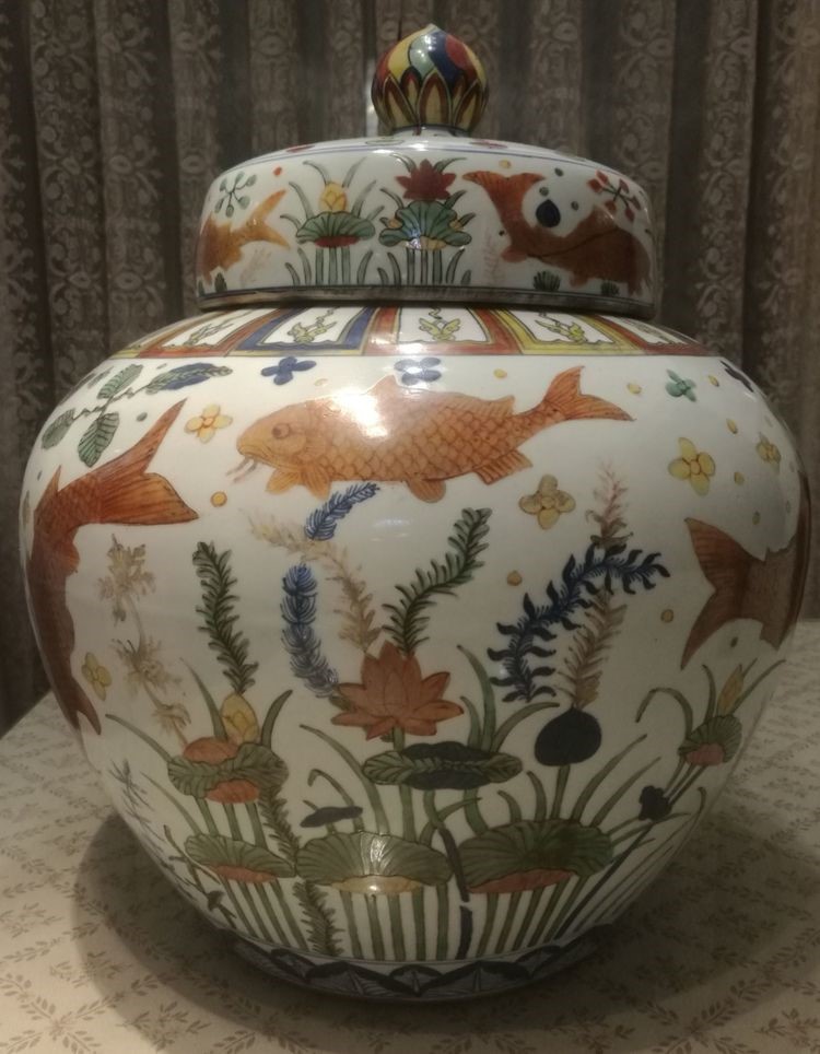 十大镇馆之宝之一,“大明嘉靖五彩鱼藻罐”h46.8Cm(存世七件:故宫博物院藏两件、天津博物馆藏一件(无盖)、国家博物馆藏一件(无盖)、上海博物馆藏一件(无盖子)、浙江金华私人藏一件、法国“吉美博物馆”藏一件,二O一七年香港苏富比拍卖一件(成交价含佣金2.1348亿元)这可谓是第八件。