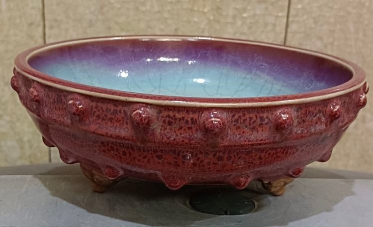 花盆托敛口、浅弧腹、平底,底下承以三个云头形足。外壁口沿下和近底处各环列一周鼓钉纹,上面一周十九枚鼓钉,下面一周十六枚鼓钉。外底刻有数目字“二” ,表明它是同套器物中尺寸属于第二大者。内施天蓝色釉,并分布着几道明显的“蚯蚓走泥纹”,外壁玫瑰紫釉与天蓝釉相交融。器表鼓钉处釉垂流明显,给人以自然生动之美感,增添了艺术魅力。