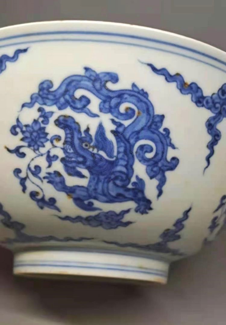 此器造型古朴典雅,胎体通透,胎质细腻,釉质十分莹润、肥厚。以“苏麻离青”料绘五爪云龙纹,绘制的纹饰笔法细腻,优美流畅,构图讲究,画工精美,龙纹栩栩如生,龙体壮硕,趾爪有力,头大,威猛。