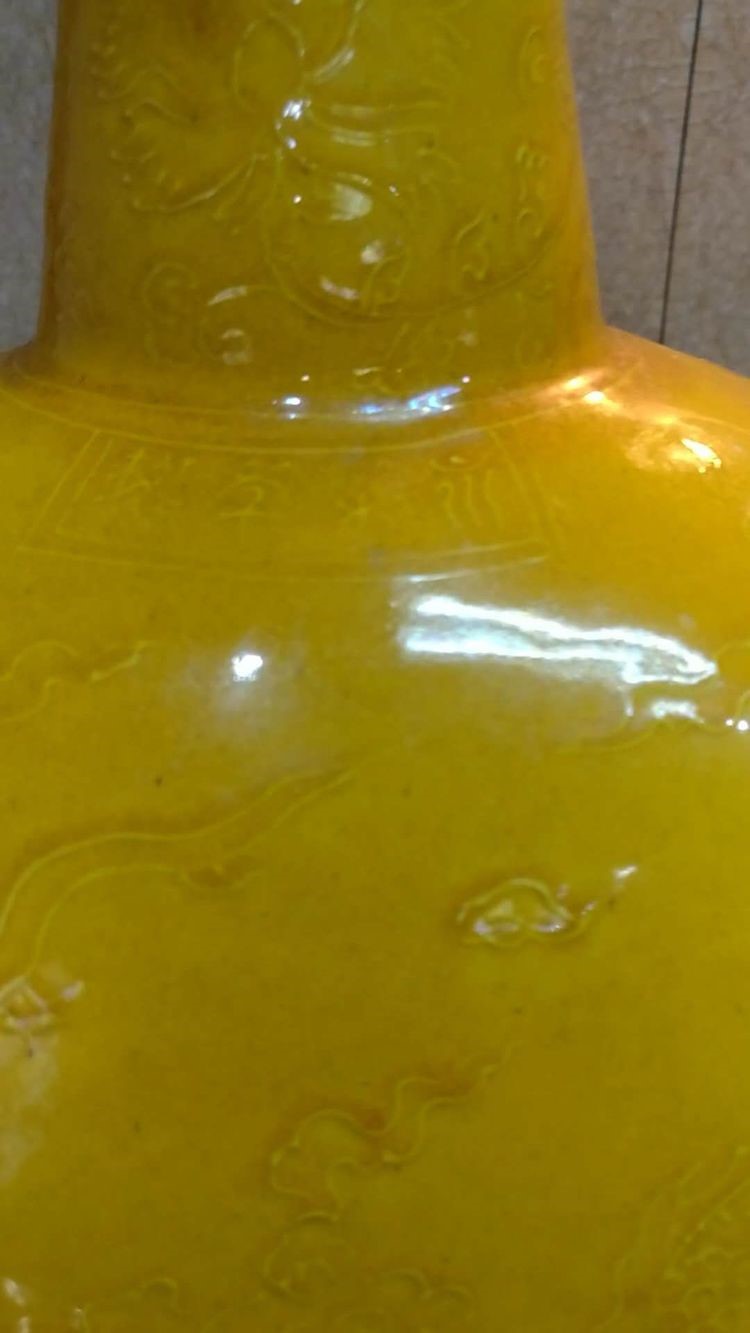 直口,长颈,丰肩,腹浑圆,瓶身纹饰剔刻而成,施白釉烧成后,覆罩黄釉二次低温烧成,瓶颈口沿外刻一圈卷草纹,瓶通刻三爪蛟龙盘缠于瓶身,间刻流云。手工刻划刀法娴熟流畅,线条纹饰清晰圆润,纹饰凸出釉面,龙发 、龙鳞纤细的刻纹与凸雕的龙爪、流云厚薄起伏的立体造型,在黄釉罩盖下,灵动感极强。釉面肥润,釉色呈鸡油黄色,细小开片纹,釉施到底。整器通体呈现出经历岁月产生的五光十色的铅釉蛤蜊光。肩部阴刻篆体“永乐年制”四字橫款。平砂底微内凹,泛铁质斑点。永乐黄釉陈设器极为罕见,此器器型硕大,造型规整,且带年款,尽显皇族的高贵气质。