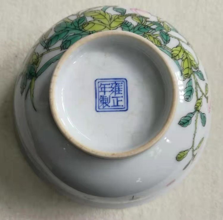 清:雍正珐琅彩荷叶小鸟过墙花宫碗