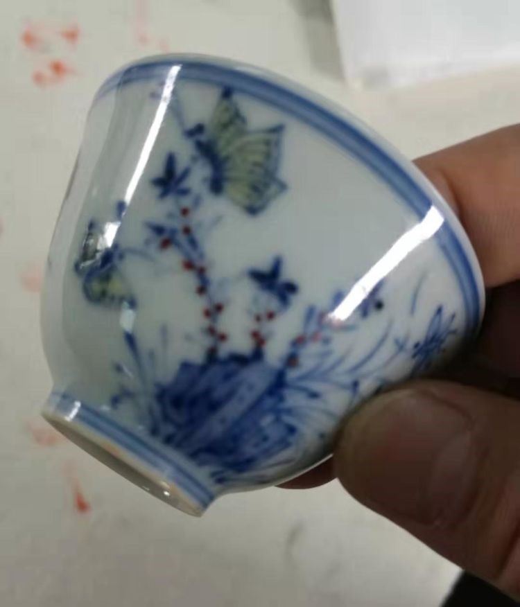 此杯的胎质细腻,呈现出洁白色。釉面滋润光洁,略带光泽。斗彩工艺运用得恰到好处,使得整个杯身呈现出一种既华丽又素雅的美感。高足部分也以斗彩工艺装饰,与杯身相呼应,形成了完美的整体效果。