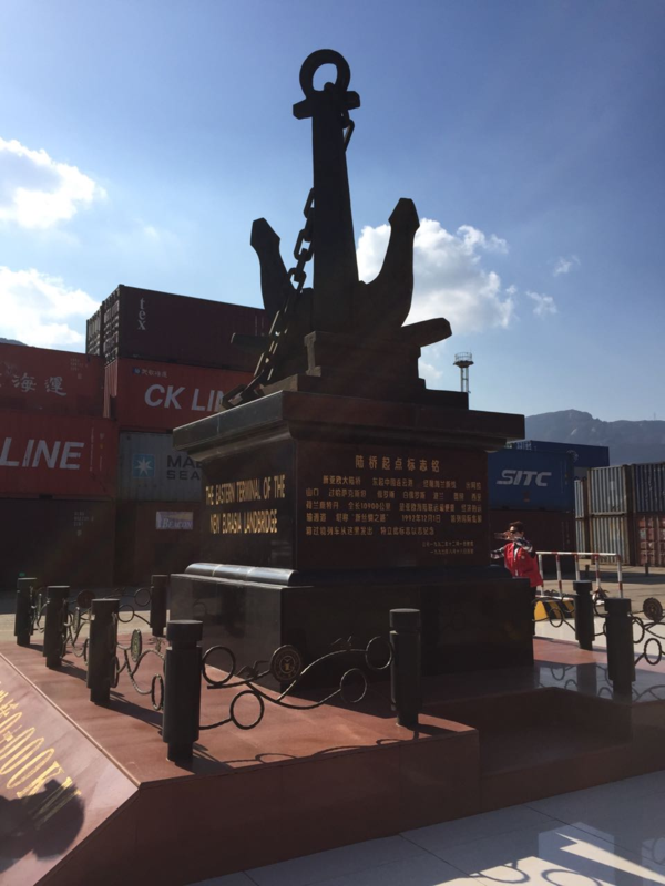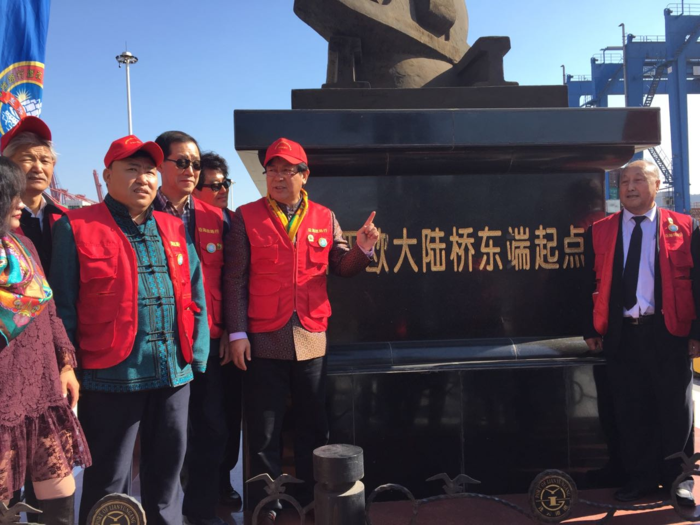 卞洪登主席与港务局领导在新欧亚大陆桥东端起点大型雕塑前合影