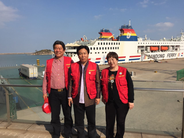 台湾同胞李复圣(左)、何若兰(右)与卞洪登博士在将要开往韩国的客货两用轮船前合影