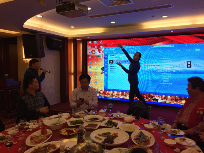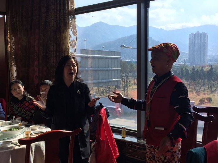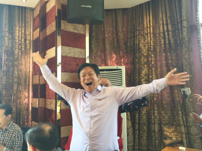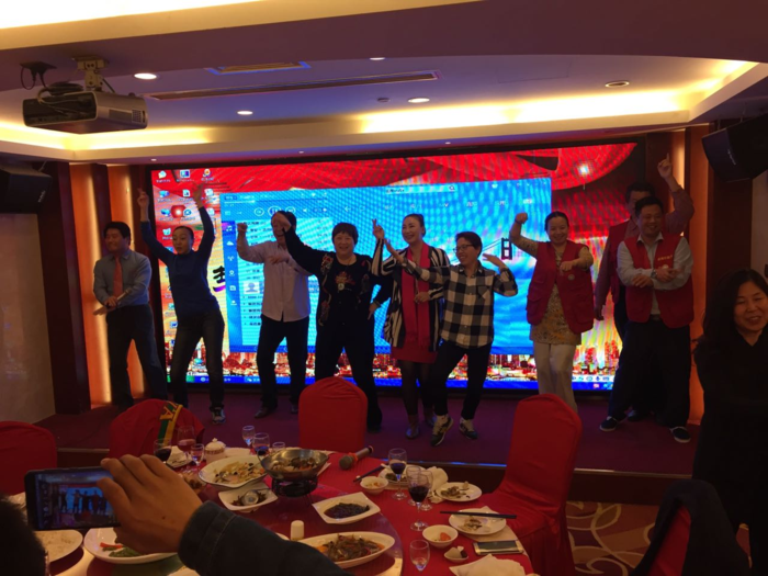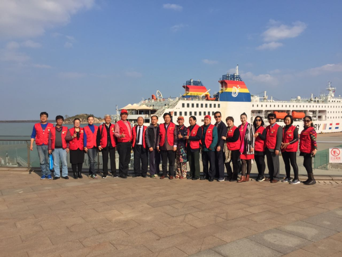 参观新亚欧大陆桥东端起点后,团员们在连云港客运码头旁的餐厅吃中餐,一路同行的壮乡歌王阿宝有任务需返京,大家与他依依惜别。阿宝为大家再次唱起嘹亮的歌声。韩国裴教授太太也与阿宝同唱一首歌,欢送阿宝,