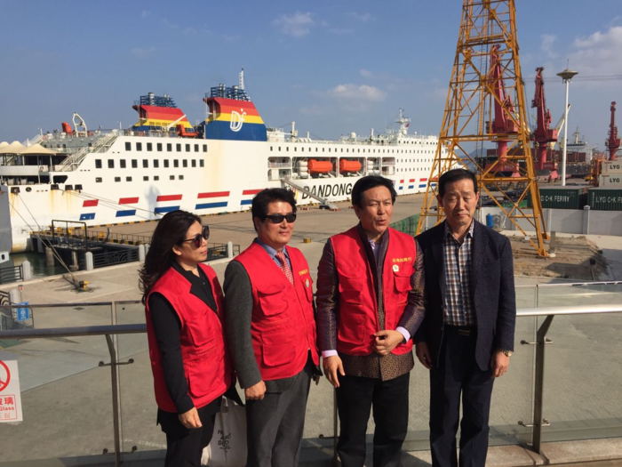 与卞洪登博士在将要开往韩国的客货两用轮船前合影,韩国丝路银行行长金星官(左)和裴教授夫妇一定感触良多