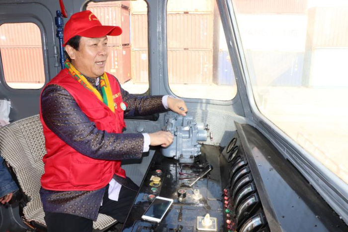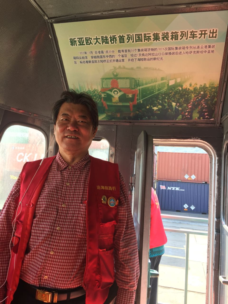 喜形于色的卞洪登主席在新欧亚大陆桥东端的内燃机车驾驶室中,感受驾驶机车奔赴丝绸之路